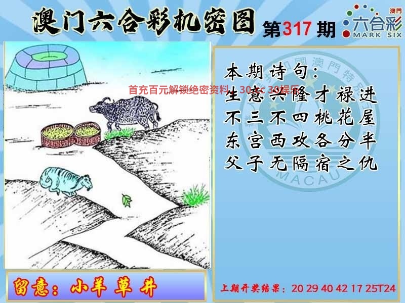 【精解澳门机密图】开(鼠18) 317期诗句:生意兴隆才禄进,不三不四桃花屋,东宫西攻各分半,父子无隔宿之仇 317期留意:小羊草井 【综合取特】马猪鸡龙牛鼠 |